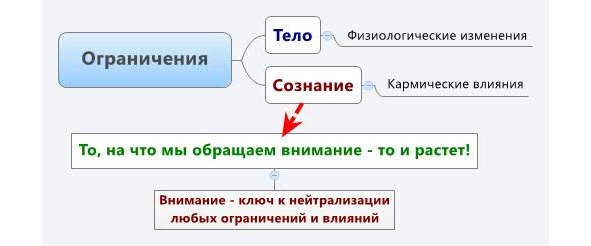 И на физиологические особенности нашего тела, и на тончайшие изменения нашего внутреннего мира мы можем влиять, сознательно направляя своё внимание. Причём . Думаем о боли – боль становится сильнее. Думаем о радости – радость растёт. Если у нас что-то болит, а мы сознательно сосредотачиваем внимание на чём-то другом (например, на сюжете книги, на далекоидущей цели, на мечте или хотя бы на кончике собственного носа), – то боль утихает, а радость – вырастает. то, на что мы направляем внимание – то и взращиваем