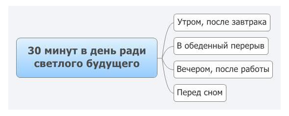 Если вам жалко выделять на достижение своих целей полчаса – выделите для начала 5 минут в день. Постепенно вы войдёте во вкус и сможете спокойно выделить 30 минут. Главное – не бросайте начатое на полпути, идите до конца.