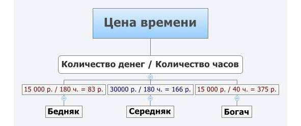 В зависимости от того, насколько цена одного часа вашего времени приближается к условной норме в 150—200 р., можно понять кто вы по уровню доходов – «бедняк», «середняк» или «богач». Бедняк – это тот, чьё время не ценится или ценится ниже среднего, а богач – это тот, чьё время наиболее ценно с точки зрения работодателя, что всегда отражается на величине соотношения время/деньги.