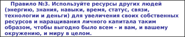 Делайте то, что вам по-настоящему интересно. Общайтесь с людьми, которые вам на самом деле интересны. Используйте ресурсы других людей () для увеличения своих собственных ресурсов и наращивания личного капитала. И делайте это таким образом, чтобы выгодно было всем – и вам, и вашему окружению, и миру в целом. И никогда не забывайте, что ! Ведите неприметный образ жизни, во всём соблюдайте меру и не теряйте свою цель из виду. Не гонитесь за непомерно высокой прибылью, делите её поровну, если ведёте совместный бизнес, и оградите себя от любых случайностей. ! энергию, знания, навыки, время, статус, связи, технологии и деньги скромность ведёт к богатству Живите в согласии, любви и дружбе