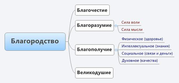 Благородство является отправной точкой для всех нравственных качеств, начиная с великодушия, доброжелательности, щедрости, честности и заканчивая целеустремлённостью, ответственностью, терпеливостью, настойчивостью, несгибаемостью и решительностью.