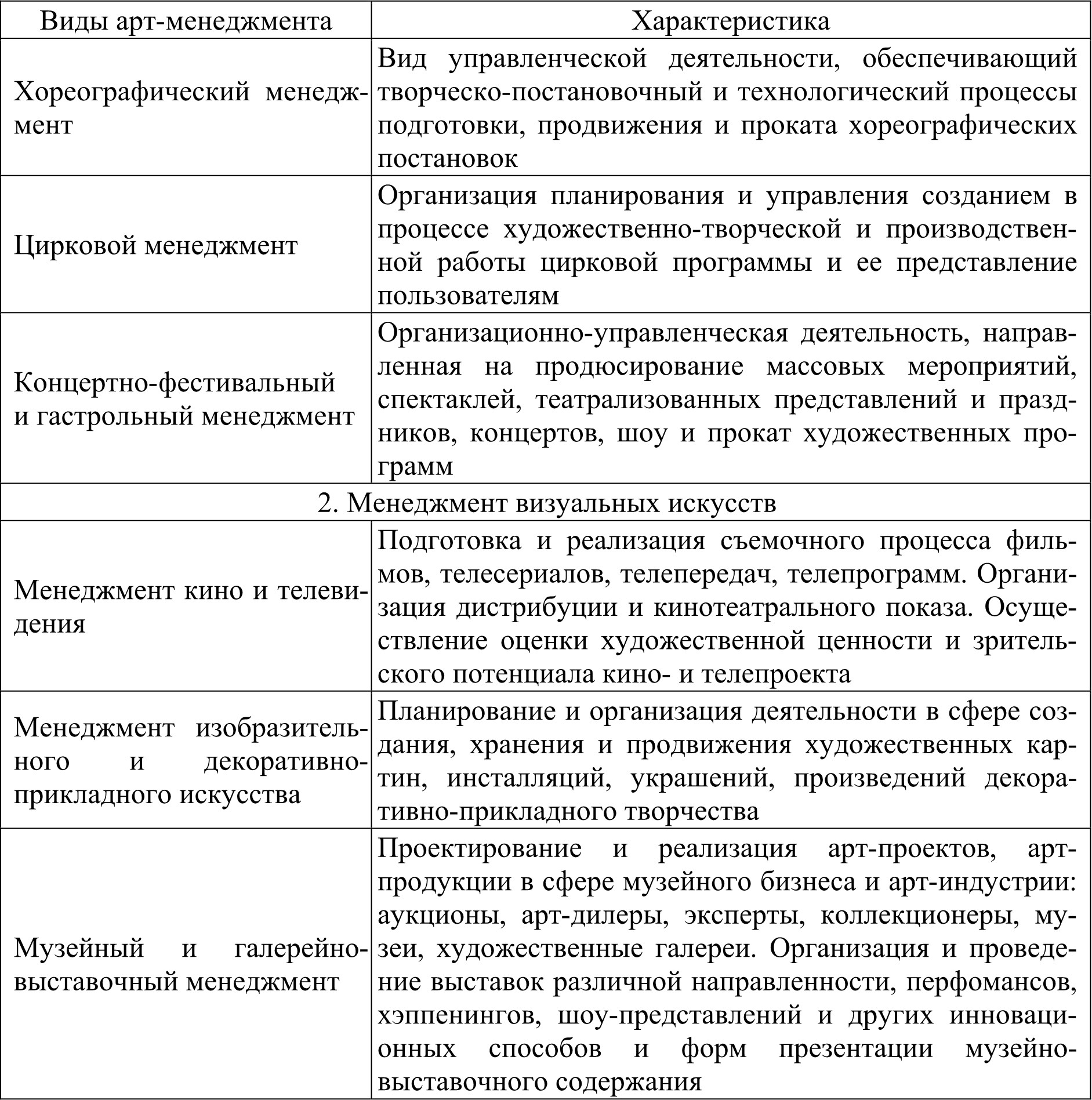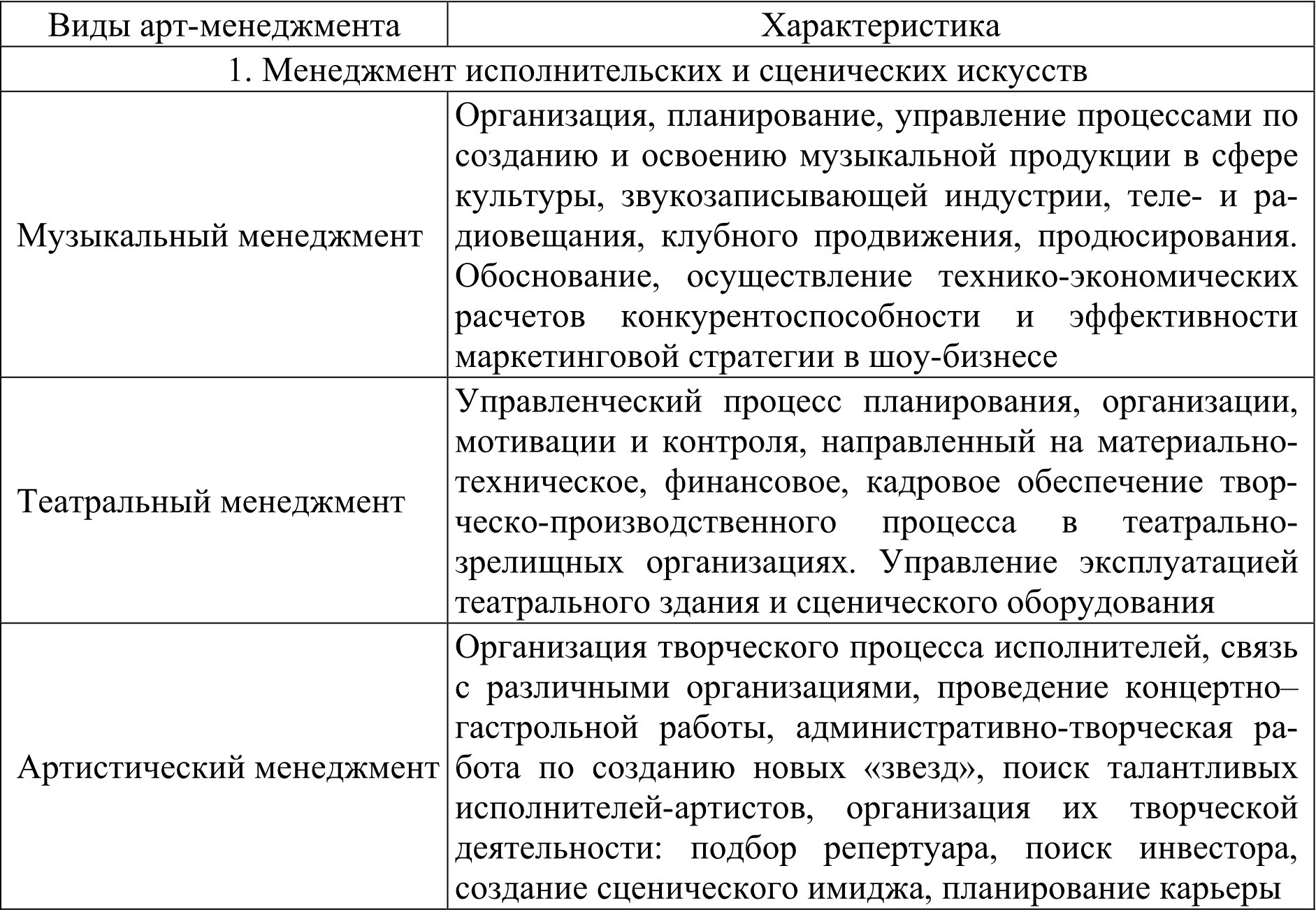 Основные компоненты арт-менеджмента тесно взаимосвязаны между собой и реализуются как составляющие единого процесса на основе комплексного использования преимуществ и особенностей каждого из них. Используя системный анализ современной управленческой практики в сфере искусства, можно выделить основные разновидности арт-менеджмента и структурно представить их в табл. 1.