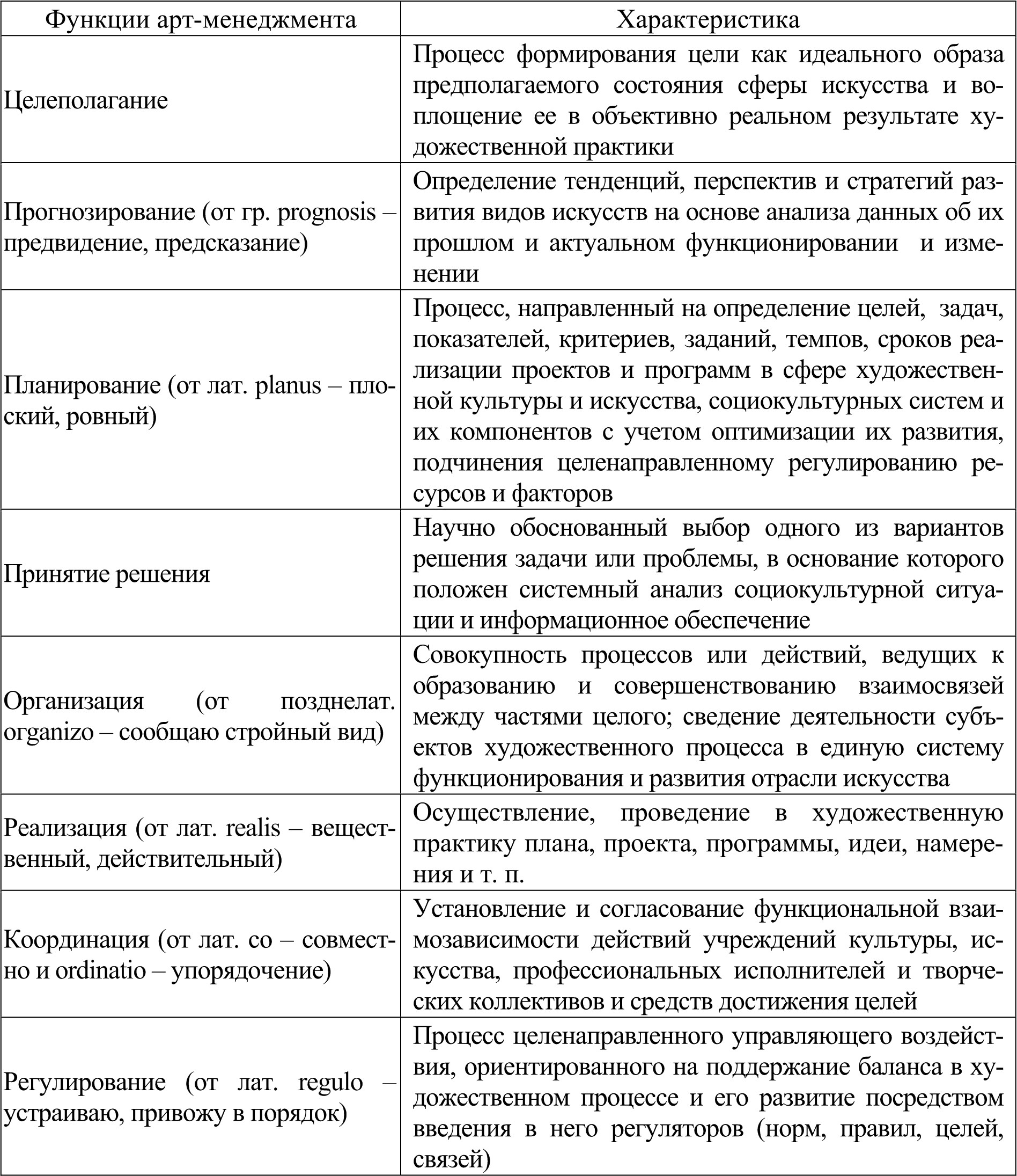 Сущность арт-менеджмента проявляется в процессе его функционирования. Исходя из методологических социокультурных оснований арт-менеджмента его функции представляют собой реализацию свойств и качеств управленческого процесса в общей структуре общества, обеспечивающих баланс, согласование и поддержку развития художественной культуры (табл. 2).