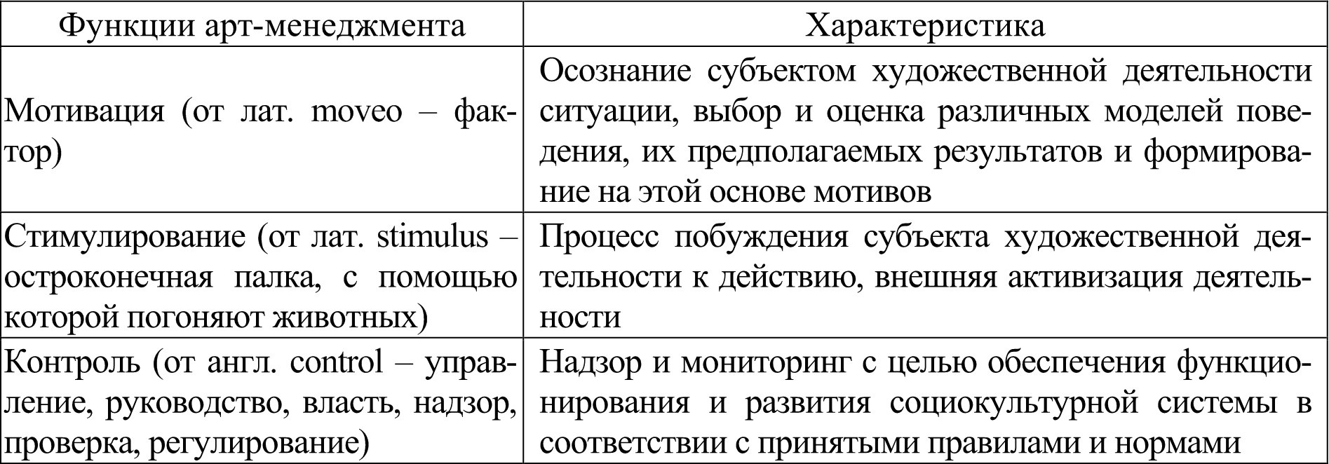 ● основные общие функции, связанные с управлением художественно-творческой деятельностью (планированием, организацией, мотивированием, контролем);