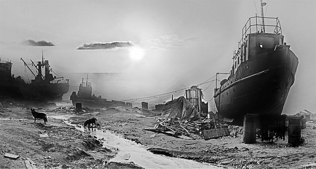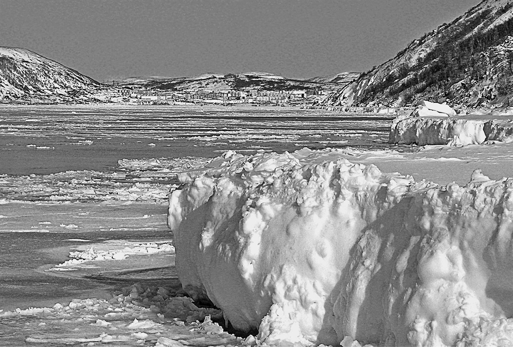 Магадан. Вид из бухты Нагаева. При отливе-приливе ледяное поле (миллионы тонн льда по побережьям) постепенно опускается/поднимается, а кромка льда у берега неподвижна