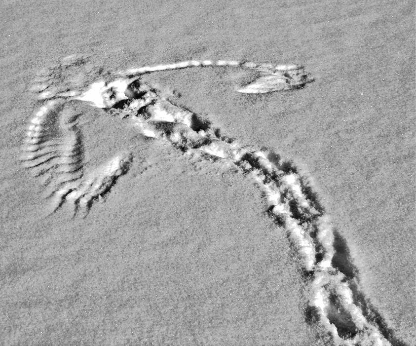 – Ворон летит вдоль лыжни и одним крылом касается снега. Жесткие перья оставляют такой след.