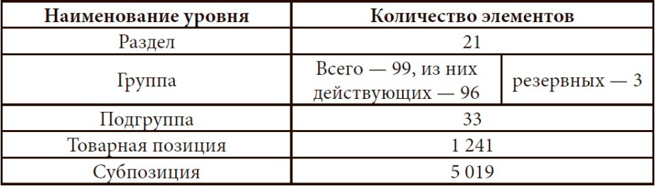 Таким образом, Номенклатура состоит из 5 уровней: разделы, группы, подгруппы, товарные позиции, субпозиции. Количество элементов, составляющих различные уровни номенклатуры, схематически можно распределить следующим образом: