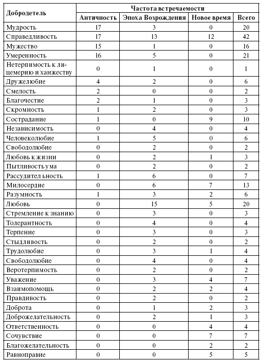 Богатый материал по данному вопросу представлен в работе В. А. Рыбина (2004). Им были проанализированы работы античных авторов (Сократа, Платона, Аристотеля, Эпикура, Сенеки, Эпиктета, Цицерона, Марка Аврелия, Демокрита, Зенона, Ксенократа, Племона, Антиоха, Евдора Александрийского, Филона Александрийского, Плутарха, Альбина, Никомаха из Геразы, Плотина), мыслителей эпохи Возрождения (Петрарки, Джованни Боккаччо, Лоренцо Валла, Пико делла Мирандола Джованни, Пьетро Помпонацци, Георга Гемиста Плетона, Лютера, Эразма Роттердамского, Рейхлина, Людовика Вивеса, Франсуа Рабле, Николая Кузанского, Парацельса, Монтеня, Пьера Шаррона, Джордано Бруно, Кампанеллы, Макиавелли, Томаса Мора), философов Нового времени (Б. Спинозы, Т. Гоббса, Д. Локка, Ф. Хатчесона, Г. Лейбница, Р. Кумберленда, А. Шефтсбери, П. Бейля, К. А. Гельвеции, Ж.-Ж. Руссо, Д. Юма, А. Смита, И. Канта, Г. Гегеля, О. Конта, Л. Фейербаха, А. Шопенгауэра, И. Бентама, П. Ж. Прудона, Т. Спенсера) и выделены добродетели, ценимые в соответствующие периоды. Мы свели эти данные в таблице 1.