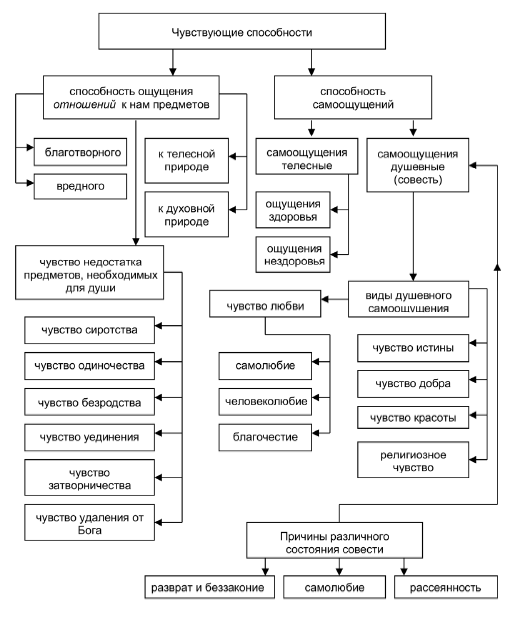 В данной систематизации особое внимание уделено таким способностям, как самоощущение, душевные (совесть), чувство любви, истины, добра, красоты, самолюбия, человеколюбия, благочестия, чувство недостатка предметов, необходимых для души. Фактически по сравнению с библейским определением духовных способностей здесь речь идет о их детализации и развитии, житейском проявлении духовных способностей.