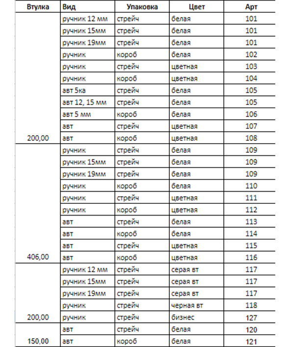 У разных компаний заведены разные обозначения одной и той же ленты. Например: ПП 12х0,6 (2300п.м.) ручная белая и 12-06-2300-101-00 одно и тоже. Важно уметь быстро и оперативно разбираться в номенклатурах. Ниже приведена расшифровка номенклатурных позиций завода Волга Полимер.