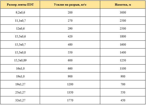 Таблица 2. Соотношение типоразмеров лент ПЭТ с разрывным усилием