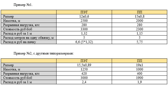 Предприятие использует ленту ПЭТ 12х0,6, хотя по схожим параметрам может использовать ПП 15х0,8 и экономить на каждой обвязке при сохранении параметров разрывных усилий.