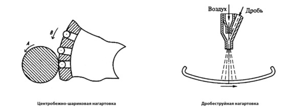 Центробежно-шариковый способ. Принцип действия метода выражается в использовании вращающегося обода, в гнездах которого расположены специальные шарики. При вращении в результате центробежной силы шарики отбрасываются в крайнее положение, нанося удар по обрабатываемой детали.6