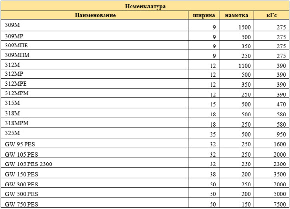 Таблица 7. Ходовые типоразмеры ленты кордстрап