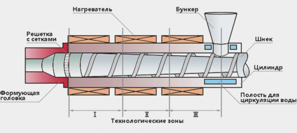 Из бункера, минуя горловину загрузочной воронки, сырьё попадает в загрузочную зону шнека, а затем транспортируется по цилиндру пластикации. От сдавливания, перемешивания и контакта с нагретым цилиндром и шнеком полимерное сырьё расплавляется и превращается в однородную массу – расплав. После чего, на выходе из формующей головки (головка снабжена адаптером, с помощью которого задаются основные настройки), получается полимерная лента, еще далекая от своего конечного состояния.