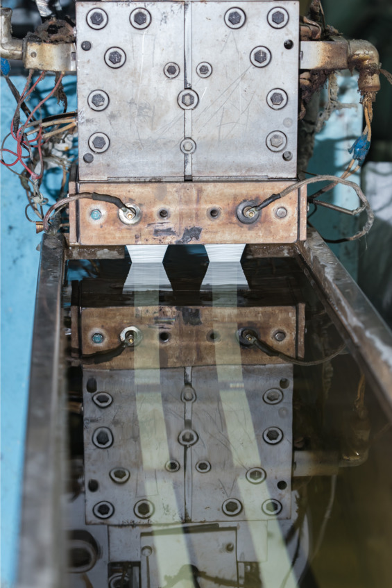 На выходе из экструдера, еще горячую, несформированную ленту, протягиваю по низу охлаждающего резервуара (его еще называются охлаждающей «ванной») для последующего закрепления на растягивающих валах.