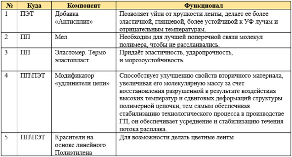 В процессе производства в полимерные ленты добавляются определенные сырьевые добавки, для придания ленте определенных физических свойств, соразмерно стоящим перед ней задачам. Это могут быть и цветные красители, и модификаторы, влияющие на эластичность.