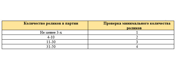 3. Количество роликов, подлежащих проверке, в зависимости от объема партии, представлены в таблице №1.