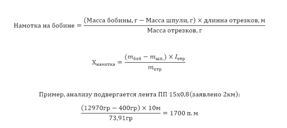 2) Выявить «недомот» достаточно просто. Для этого нужно сперва взвесить неначатую бобину, затем отрезать от ленты от 3-х до 10-ти метров12 и взвесить на весах. Затем в пропорции к весу бобины, определить реальную намотку.