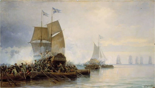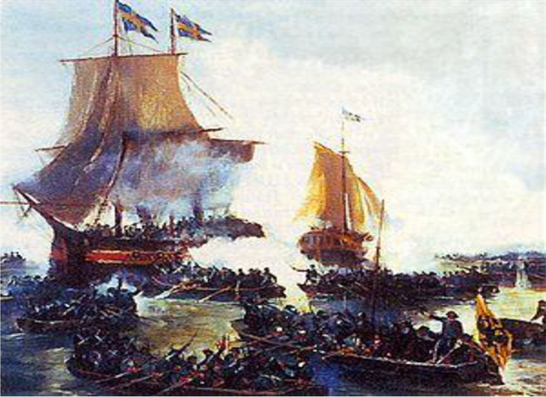 К берегу двинулось до полусотни шлюпок. На их борту тысяча семьсот шведских отборных гренадер. Едва шлюпки ткнулись в песок, шведы попрыгали в воду и, еще не доходя берега, развернулись в атакующие порядки. И вот, когда до спасительной суши оставались какие-то метры. Появившиеся буквально неоткуда преображенцы произвели первый залп. Наши били в упор и практически никто не промахнулся. Первы ая шеренга шведом была мгновенно выкошена. На поверхности плавали лишь шапки гренадер…