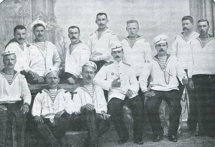 Фотография членов команды броненосца «Потёмкин». В центре группы – лейтенант Л. К. Неупокоев.