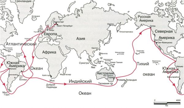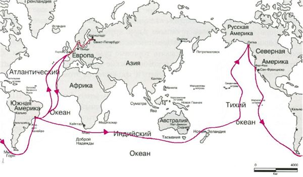 Маршрут кругосветного плавания М. П. Лазарева на фрегате «Крейсер» в 1822–1825 гг.
