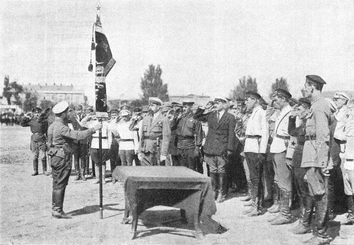 Командующий войсками Украины и Крыма М. В. Фрунзе вручает Почётное революционное Красное Знамя начальнику 51-й дивизии П. Е. Дыбенко. Крым, 1921