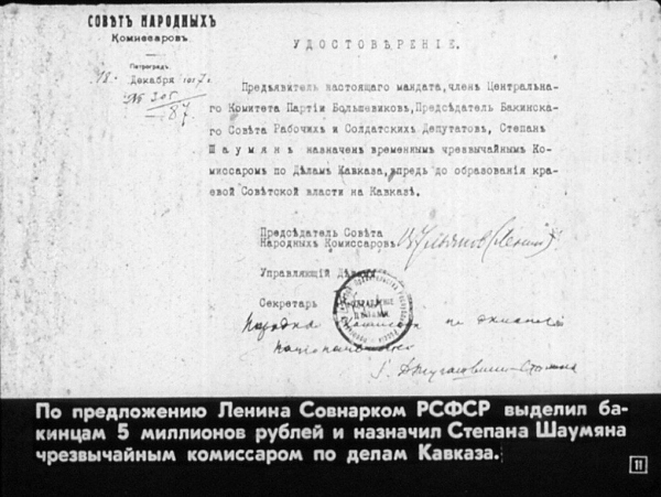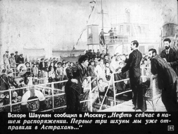 Телеграмма из комиссариата по морским делам С. Е. Саксу о принятии чрезвычайных мер для усиления Каспийской военной флотилии: «Ввиду грозной опасности, которой подвергается Баку, необходимо приложить все усилия к ускорению работ по оборудованию Каспийской флотилии. Не нужно щадить ни сил, ни средств. Вы уполномочиваетесь приглашать специалистов и вообще работников по чрезвычайным нормам. Вы обязуетесь неуклонно наблюдать за тем, чтобы работы производились с наивысшей точностью. О ходе работ докладывать ежедневно».