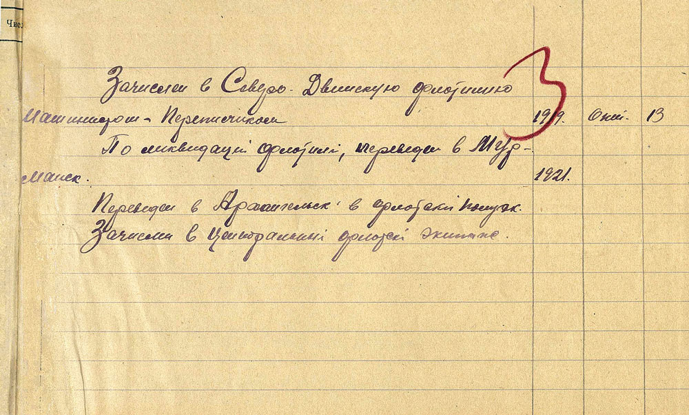 Запись в личном деле Н.Г. Кузнецова о службе в годы Гражданской войны на Северодвинской флотилии. Из фондов ЦГА ВМФ. Публикуется впервые