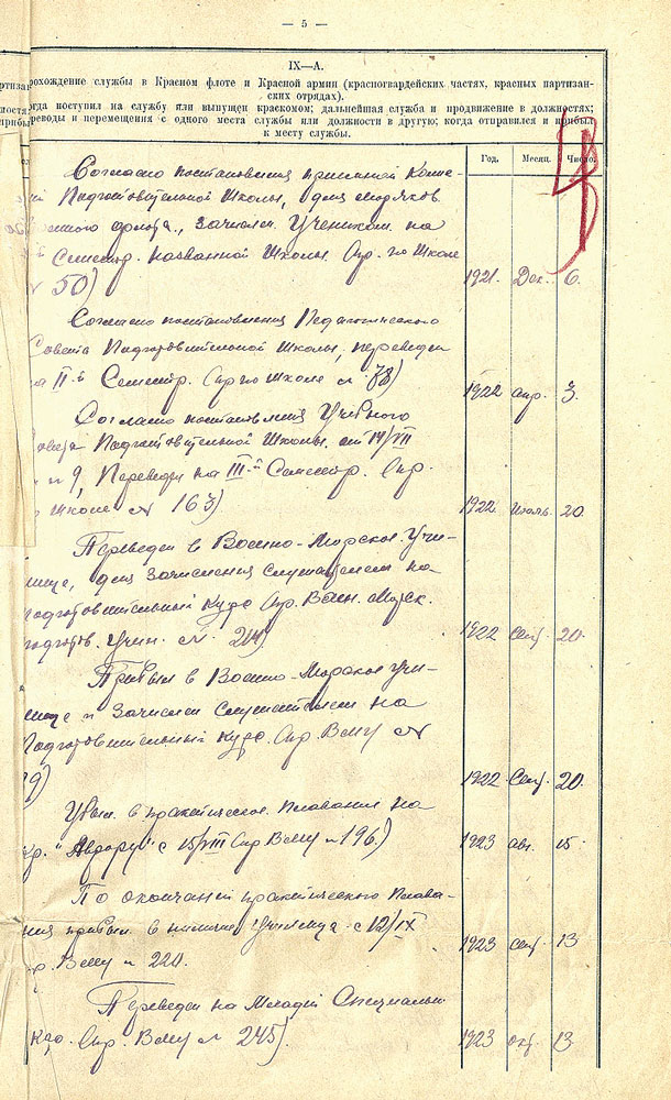 Основные этапы учебы Н.Г. Кузнецова в ВМУ имени М.В. Фрунзе. Из личного дела Н.Г. Кузнецова. Из фондов ЦГА ВМФ. Публикуется впервые