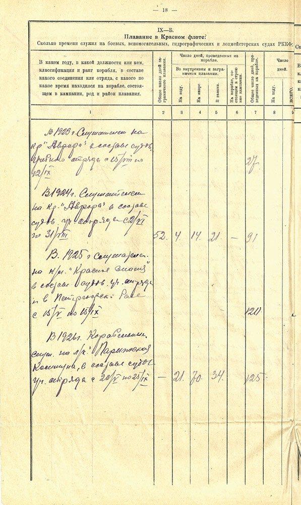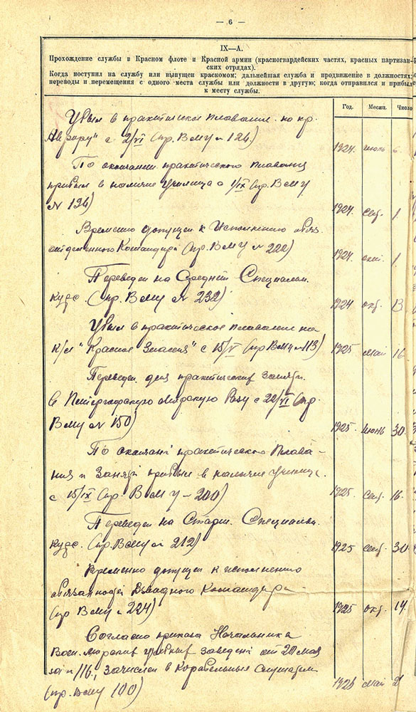 Послужной список Н.Г. Кузнецова на момент окончания Военно-морского училища в 1926 г. Из фондов ЦГА ВМФ. Публикуется впервые