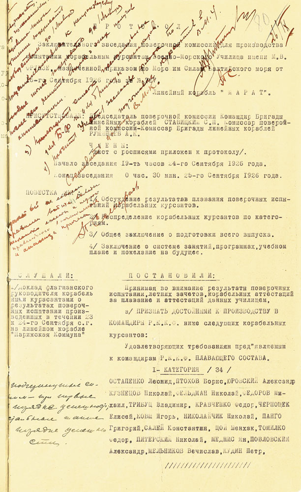 Постановление о присвоение выпускнику училища Н.Г. Кузнецову звания командира РККФ 1-й категории. Из фондов ЦГА ВМФ. Публикуется впервые
