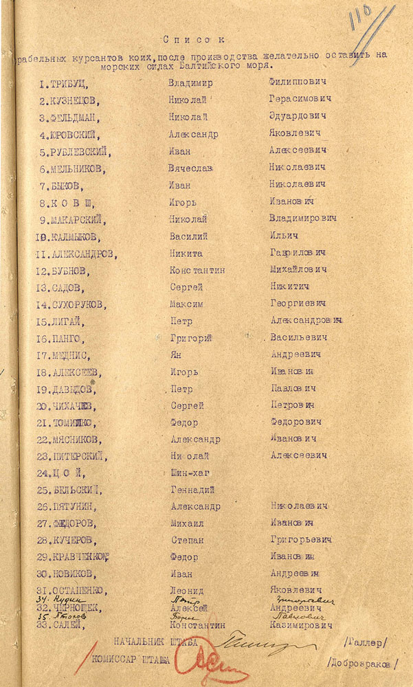 Список выпускников ВМУ имени М.В. Фрунзе 1926 г., кому было предложено продолжить службу на Балтийском флоте. Вторым в списке – Н.Г. Кузнецов. Из фондов ЦГА ВМФ. Публикуется впервые