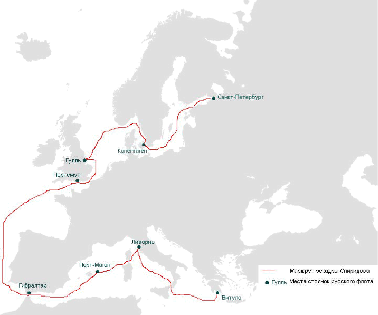 Карта перехода эскадры Спиридова из Кронштадта в Эгейское море