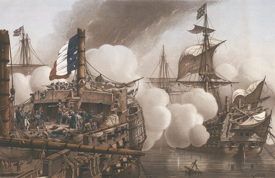 В 9 часов утра французский линейный корабль привелся к ветру и стал выходить на позицию открытия огня.