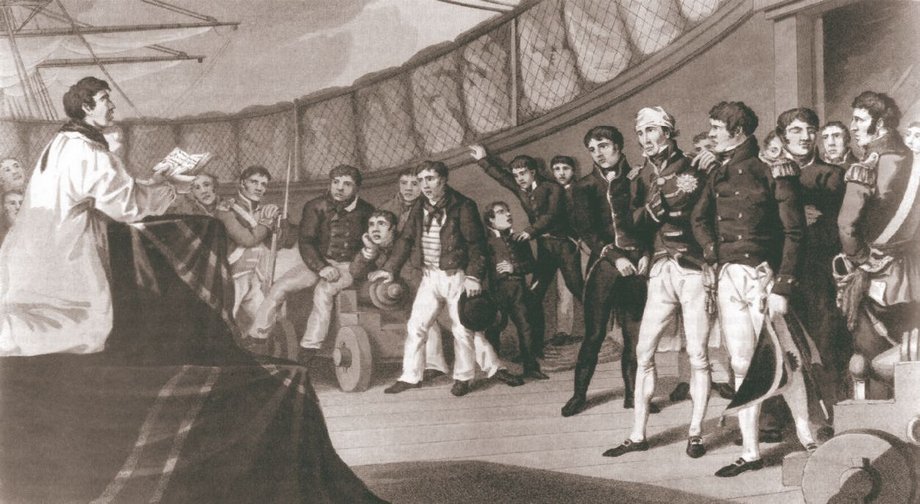 Молебен на флагмане Нельсона Вэнгарде после Абукира. Раненного Нельсона поддерживает капитан Берри