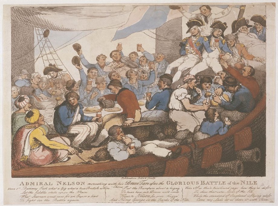 Карикатура на Нельсона и его команды борту «Вэнгард» после битвы на Ниле. Эта карикатура отражает национальные чувства британцев к Нельсону, к его поведению и отношению к своим людям.