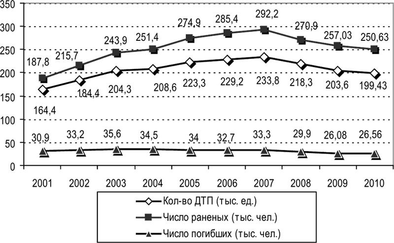Начнем анализ с рассмотрения общих закономерностей дорожно-транспортной аварийности по России в целом[51].