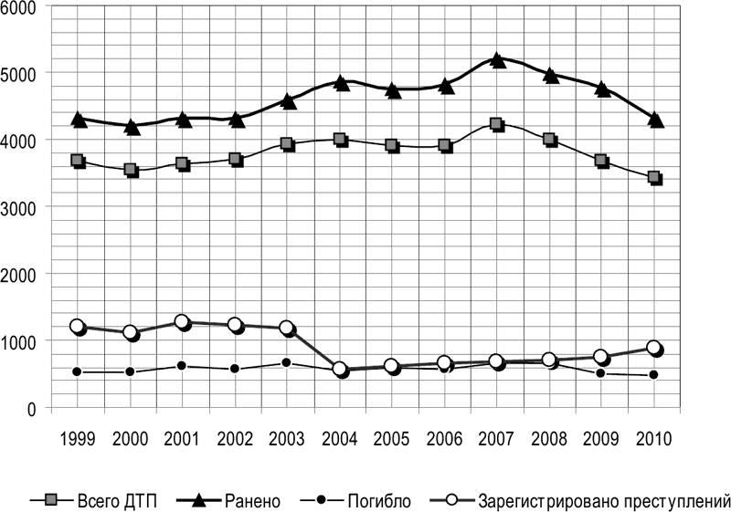 Обращает на себя внимание и цикличный характер кривой дорожно-транспортной аварийности (как и кривой числа раненых). Каждый виток цикла при этом укладывается в вектор тенденции к увеличению количества ДТП и пострадавших. Исключение составляют 2009 и 2010 годы, которые могут отражать определённые изменения в рассматриваемом явлении.