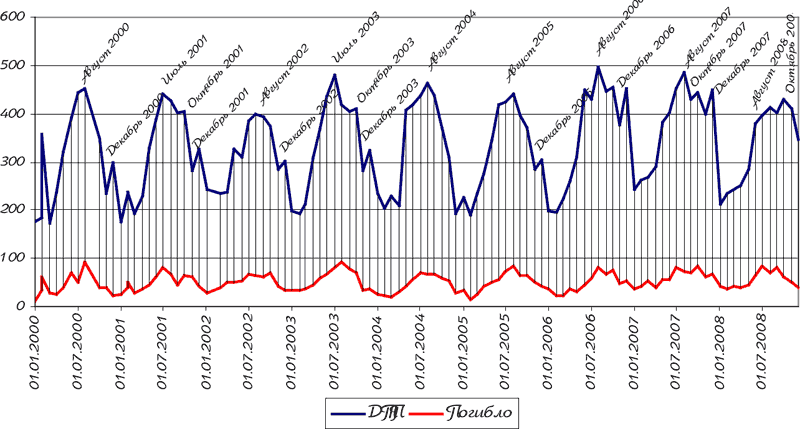 Развитие дорожно-транспортной аварийности, а также смертности на приведённой диаграмме во времени выглядит как повторяющиеся устойчивые сезонные колебания (циклы).