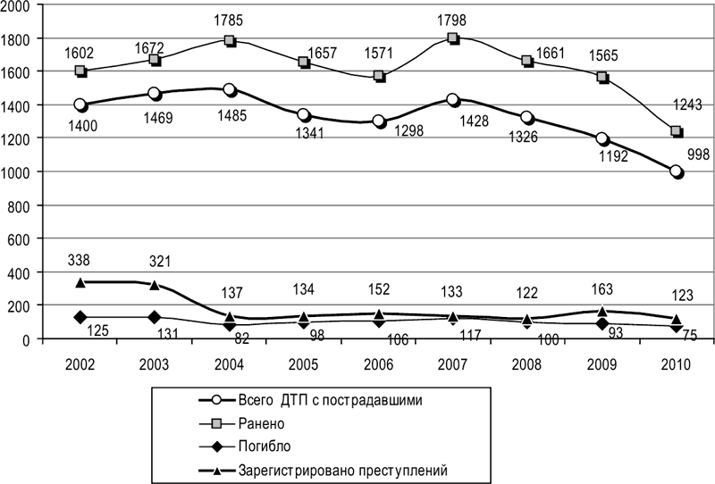 Диаграмма 4. Показатели дорожно-транспортной аварийности и зарегистрированных дорожно-транспортных преступлений в г. Иркутске за 2002–2010 гг.