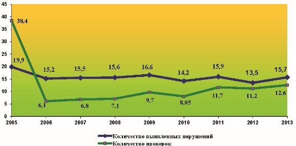 В 2013 году было организовано и проведено более 12,6 тыс. проверок по вопросам предоставления работникам гарантий и компенсаций, в ходе которых выявлено около 15,7 тыс. правонарушений (в среднем 1,2 нарушений, выявленных в ходе одной проверки).