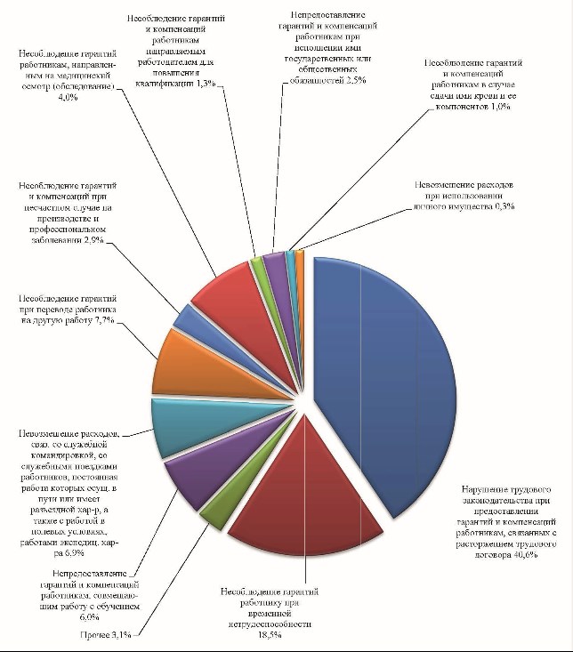 Характер и типология выявленных в 2013 году правонарушений по вопросам предоставления работникам установленных законодательством гарантий и компенсаций свидетельствуют, что, как и в предыдущие годы, проблема соблюдения работодателями требований законодательства по этим вопросам продолжает оставаться достаточно актуальной. Нарушение работодателем трудового законодательства в части предоставления установленных гарантий и компенсаций имеет место практически по всем их видам.
