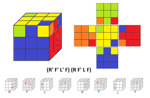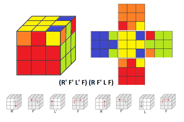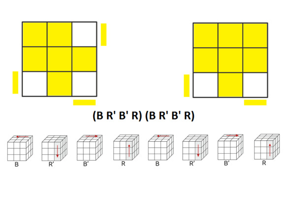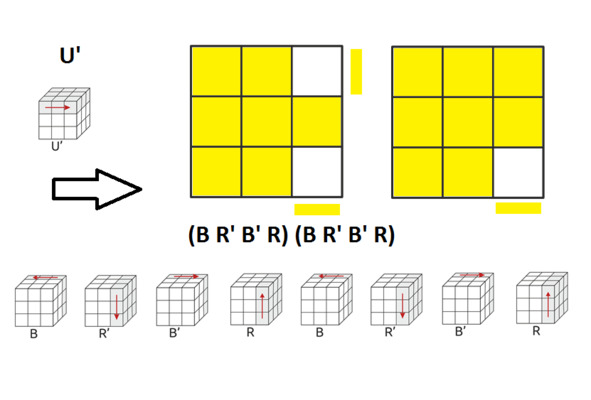 В данном примере мы получаем следующий алгоритм: (B R` B` R) (B R` B` R). Движения алгоритма сгруппированы в две группы скобками, чтобы их было легче воспринимать и запоминать.