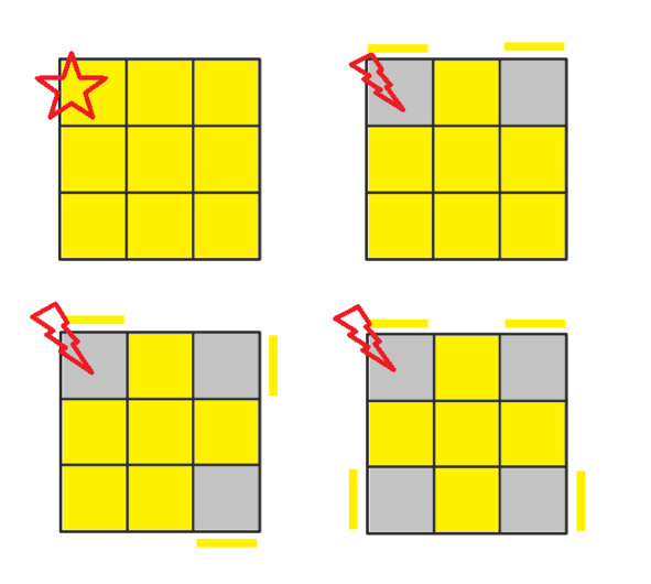 Хорошие новости! Для всех случаев (кроме первого, конечно) подходит один и тот же алгоритм. Смотрите на куб сверху (в нашем примере это желтая плоскость). Желтые полосы по краям углов на иллюстрации показывают, где желтые наклейки находятся на угловых элементах, которые необходимо правильно перевернуть.