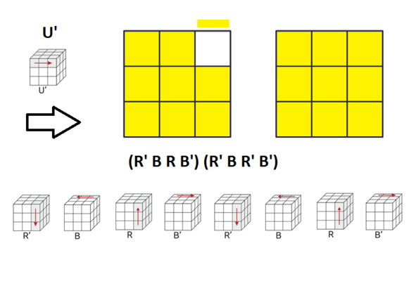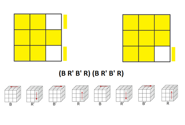 Тогда после выполнения, например, первого алгоритма (B R` B` R) (B R` B` R) и после перемещения верхней плоскости вращением U`, мы обнаружим, что необходимо запустить второй цикл вращений «нажав» на другой стороне, так как наклейка желтого цвета находится на ней. В этом случае алгоритм можно записать следующим образом: (R` B R B`) (R` B R` B`). Но по своей сути – это одни и те же движения!