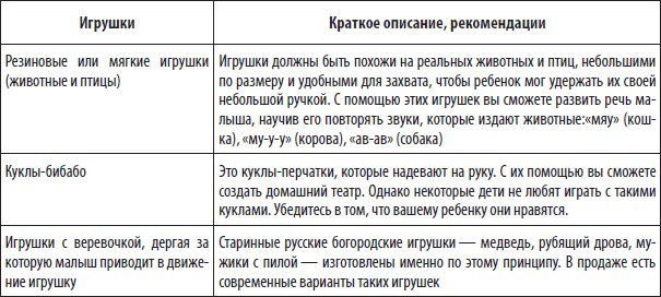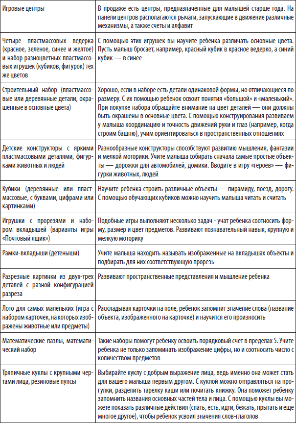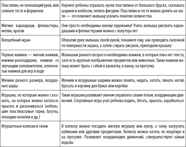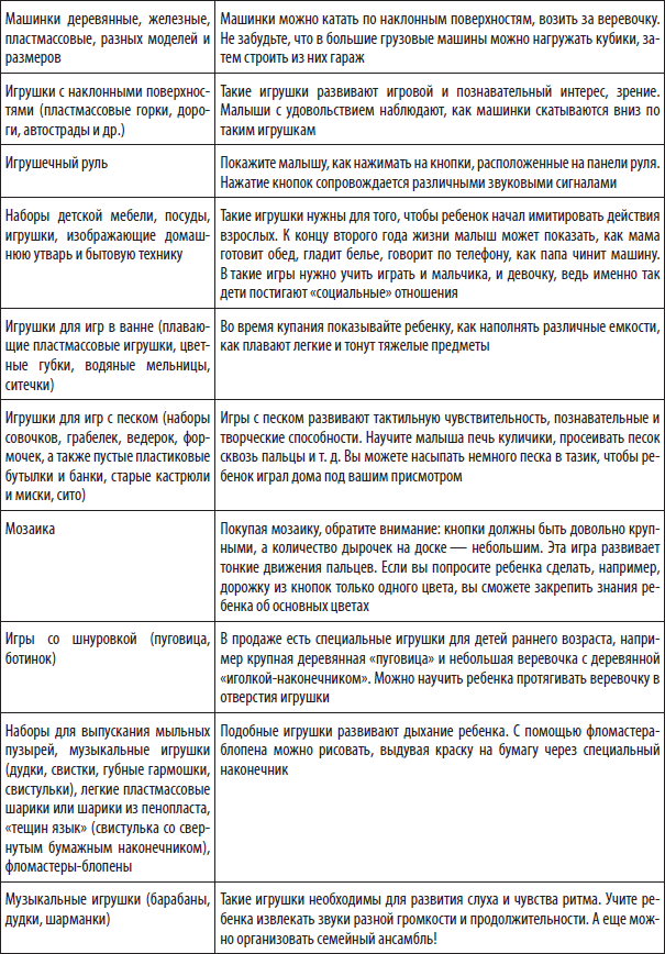 На втором году жизни действия ребенка с игрушками и предметами усложняются: он не просто манипулирует ими (стучит, бросает на пол, тянет в рот), а начинает использовать их по назначению (возит машинку, катает и пинает мячик и т. п.). Краткий перечень рекомендуемых игрушек, их описание и рекомендации по использованию приведены в таблице 1.