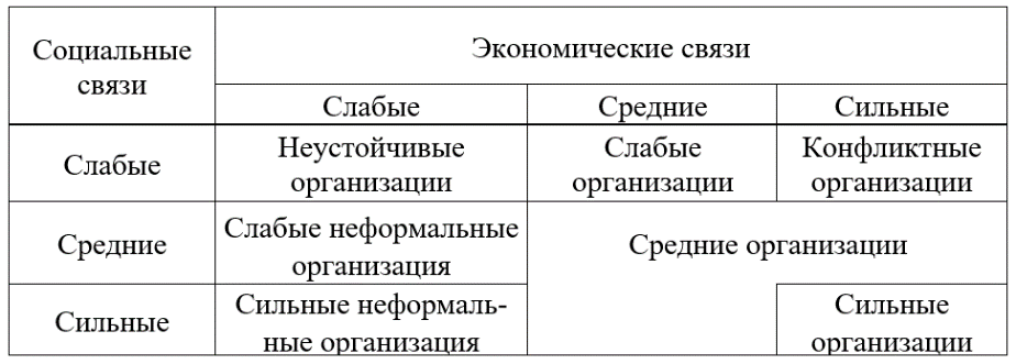 Для социально-культурных или социально-образовательных организаций таблица будет иметь такой же вид, если заменить слова «экономические связи» на культурные или образовательные. Эта таблица имеет очень большое практическое значение при создании или диагностике организации.