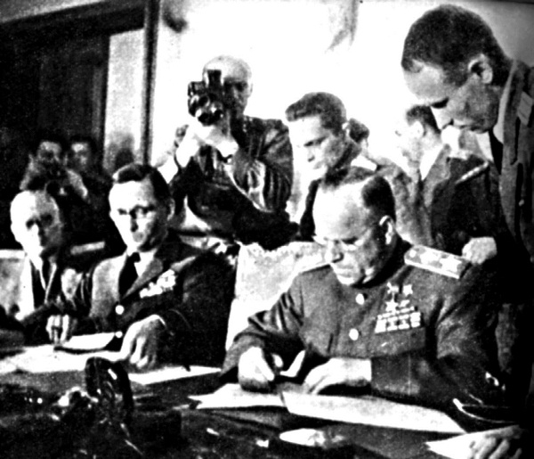 «Капитуляция, – заявлял И. В. Сталин 7 мая 1945, – должна быть учинена как важнейший исторический факт и принята не на территории победителей, а там, откуда пришла фашистская агрессия: в Берлине, и не в одностороннем порядке, а обязательно верховным командованием всех стран антигитлеровской коалиции. Пусть ее подпишет кто-то из главарей бывшего фашистского государства или целая группа нацистов, ответственных за все их злодеяния против человечества».