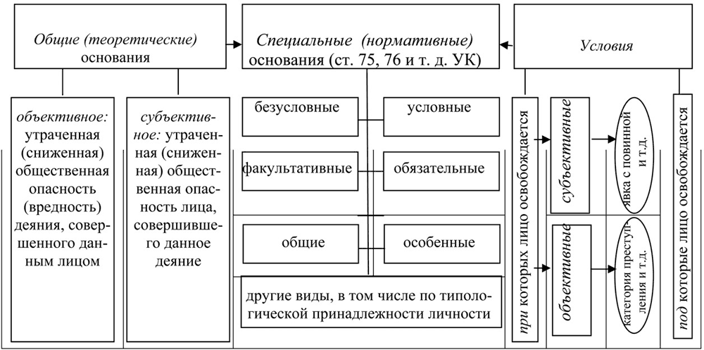 Все названные позиции в той или иной мере отражают единый правовой результат – прекращение уголовно-правовых отношений между государством и лицом, совершившим предусмотренное уголовным законом деяние. Основание же освобождения от уголовной ответственности, как следует из предшествующего параграфа, представляет собой совокупность условий, свидетельствующую об утраченной или сниженной общественной опасности лица, совершившего предусмотренное уголовным законом деяние, об утраченной или сниженной общественной опасности его деяния, и позволяющую условно или безусловно прекратить в процессе дознания, предварительного следствия или судебного разбирательства уголовно-правовые отношения между компетентным государственным органом (дознания, предварительного следствия, прокуратуры, суда) и данным лицом.